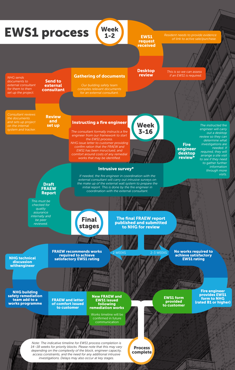 While the EWS1 form can be important for those buying and selling a home, especially in taller buildings, the process is not how we determine the safety of a building. We have a thorough system of checks, investigations and safeguards carried out by surveyors and building safety experts, both who work for Notting Hill Genesis and for external consultants. It is this work that ensures the safety of our residents and buildings, and identifies where work is required to the external wall.
